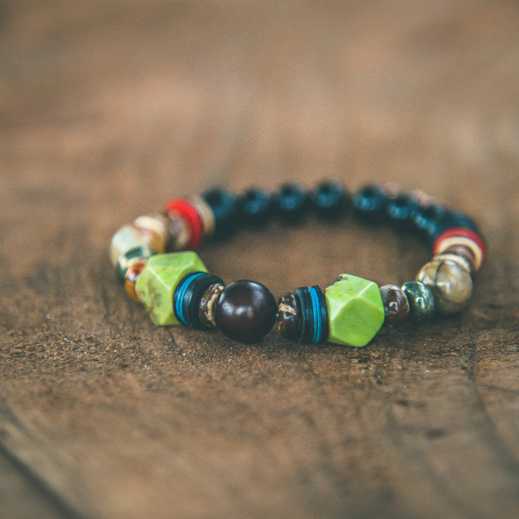 Makena Abundance features a combination of natural materials of including Buri Wood, Coconut Shell, Pyrite, Red Creek Jasper, Black Stone, and chunky Turquoise nuggets. All of our handmade beaded bracelets are done with free spirit design which are wonderful to wear and show off. Vintage record vinyl spaces separate the Coconut Shell from the Turquoise. The Buri Root Wood beads form the base of nature's bracelet, leading to textured discs of Black Stone and Jasper, all threading through durable and stretchable wire. This bracelet is amazing when worn alone and looks great when stacked with other handmade beaded bracelets in the collection. Try stacking with Trillium, Spiritual Warrior and Sundance bracelets for a unique pattern and feel.