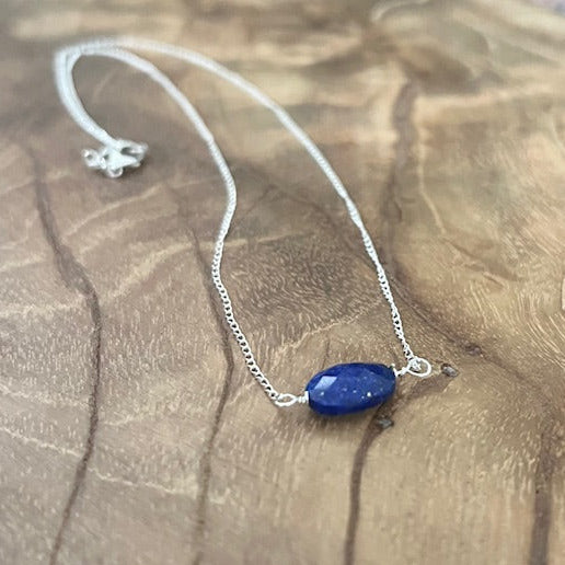 This handcrafted Lapis Lazuli necklace features a faceted oval gemstone set in sterling silver, designed to support truth, intuition, and spiritual clarity. Known as a powerful healing crystal, Lapis Lazuli has been cherished for centuries for its deep blue beauty and its ability to awaken inner wisdom and self-expression.