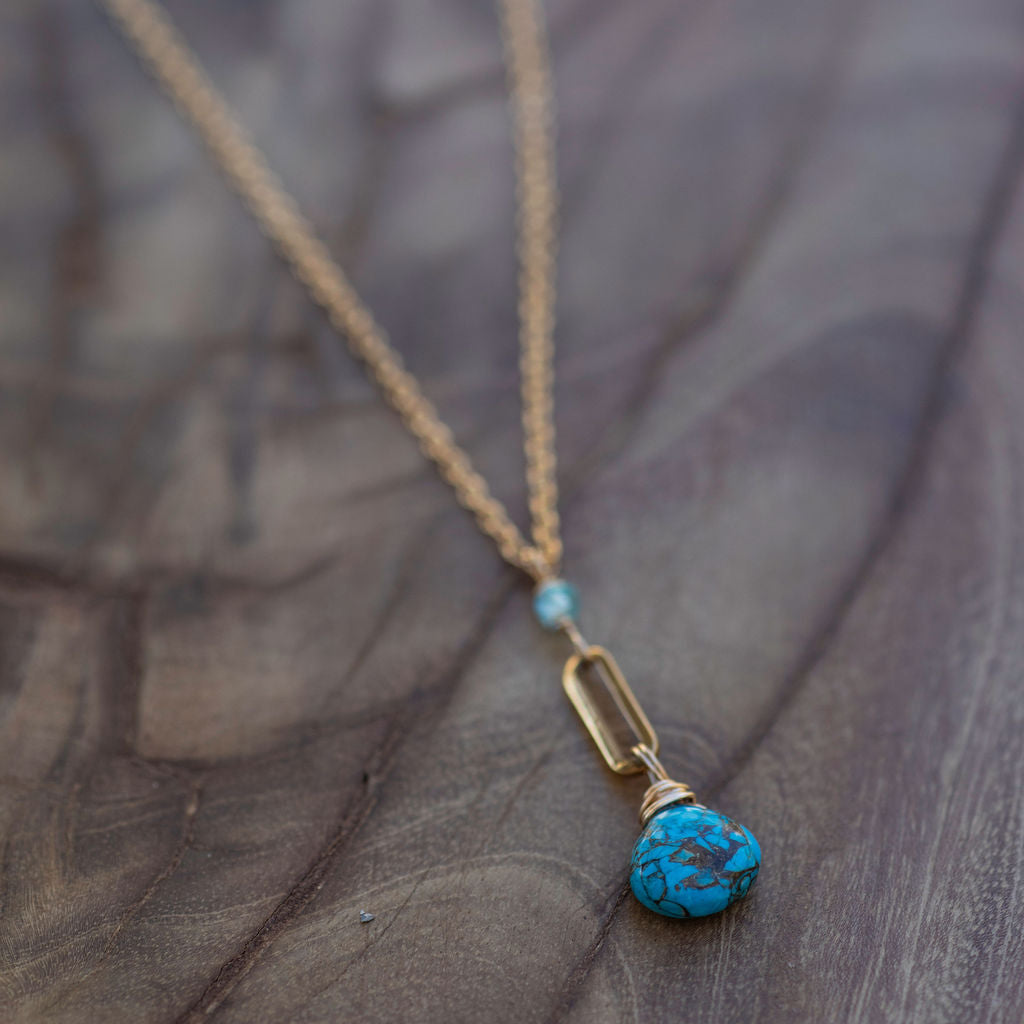 The turquoise is thoughtfully wire-wrapped and suspended beneath a sleek gold accent bar, creating a clean, elongated silhouette that draws the eye and adds a modern, elevated feel. A delicate 14k gold filled chain completes the design, offering warmth and durability while allowing the natural beauty of the stone to remain the focus.